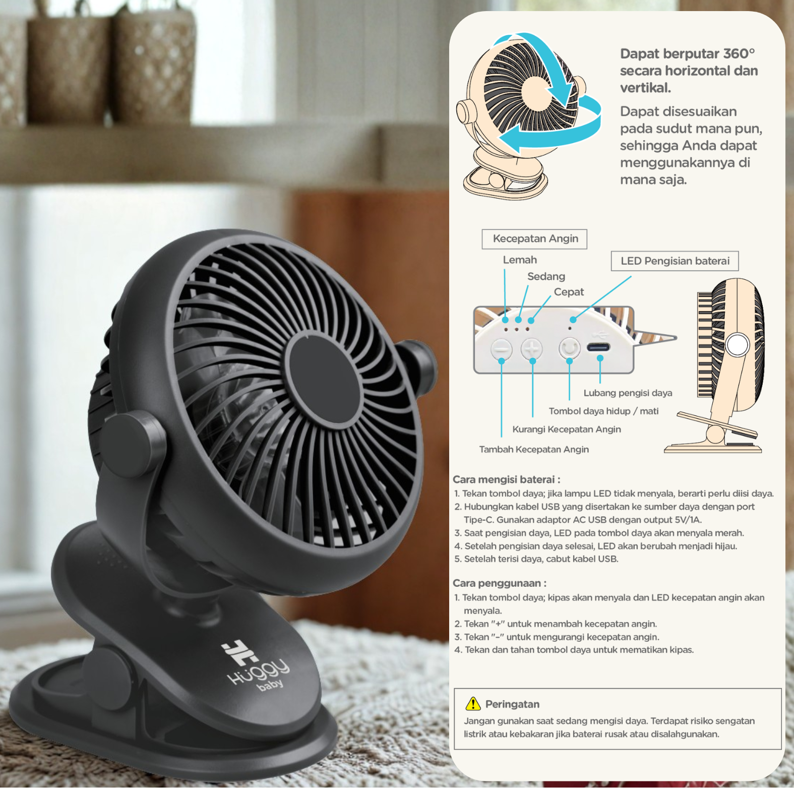 Huggy Baby FAN02 EzFit Clip Fan | Kipas Angin Stroller Anak Multifungsi
